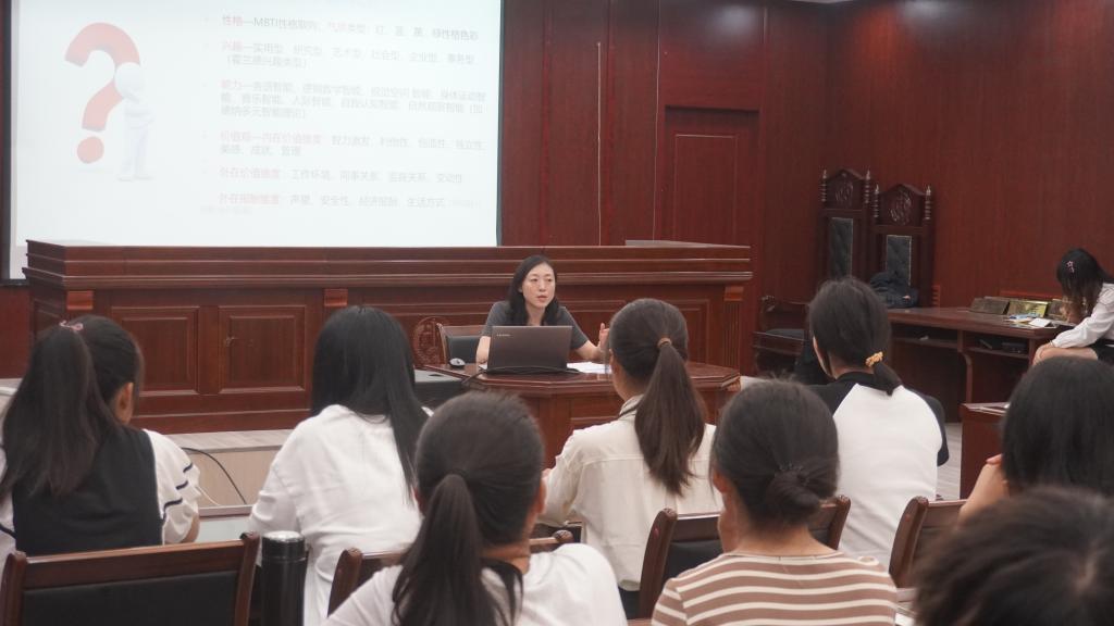 2023级新生入学教育系列活动之就业指导与生涯规划讲座在燕山校区模拟法庭举行,讲座由学院就业办郭蕾老师主讲。