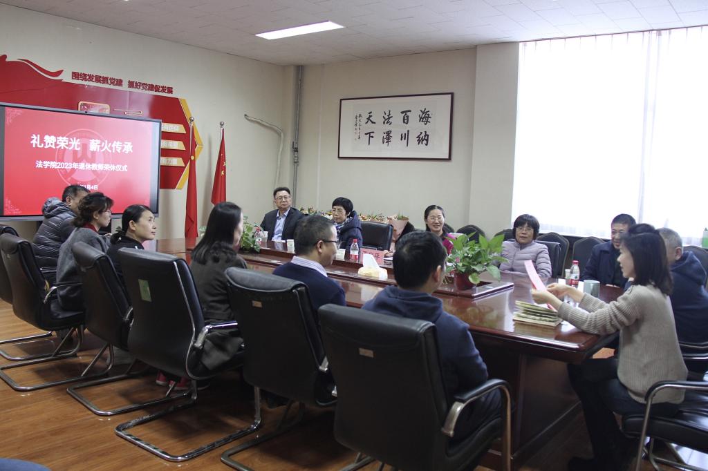 举行2023年退休教师荣休仪式。退休教师闫宝龙、王春婕、何翠凤、于忠翔受邀参加仪式,离退休工作处党委书记于光平、学院党委书记危红、院长赵信会、党委副书记田军、沙林斌、学院副院长王莉莉、学院工会主席李同武、学院工会副主席赵晗以及各系教师代表、青年教师代表共同见证了这一光荣时刻。