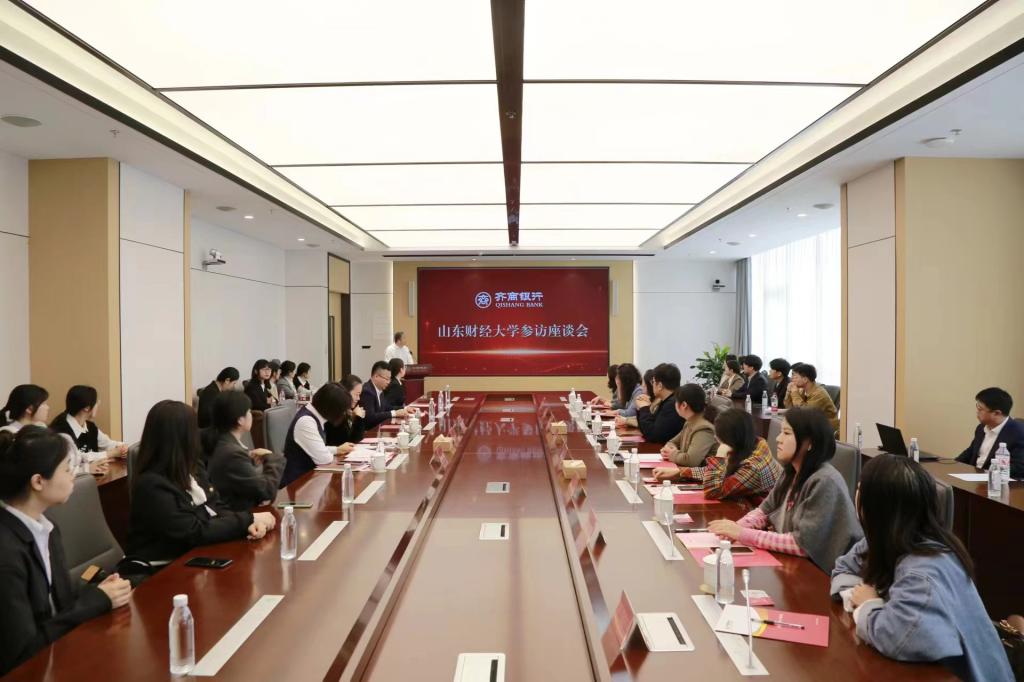 就业办主任郭蕾携24届本科生、研究生共16人随校就业指导处领导老师一行赴齐商银行总行开展“访企拓岗促就业”活动。齐商银行党委委员、工会主席、董事会秘书马慧玲、组织和人力资源部总经理马刚、副总经理马翠华热情接待并与会座谈。