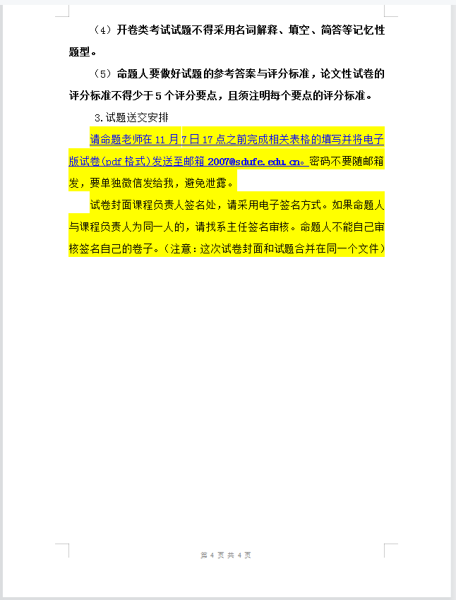 附件下载: 附件4:试题模版及封面、试题参考答案与评分标准模板、变更考核方式申请表.zip(请务必使用本次模板) 试题封面及试题模板.docx(之前发的模板不带页码,教务处重发了,请用这个带页码的模板) 附件5:期末考试试卷填报说明.docx 压缩文件设置密码.jpg 更正,我的邮箱是20070385@buyugame.net,下面截图那个不对,请大家注意发这个邮箱