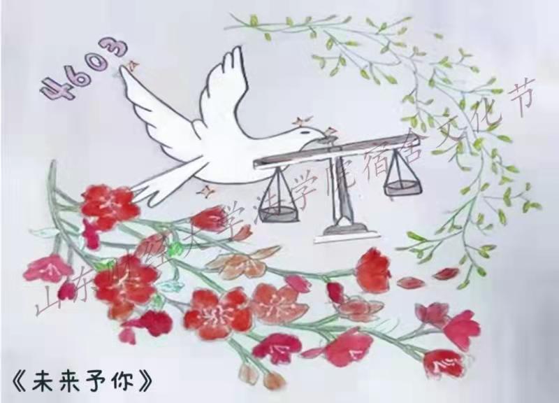 学科专业特色、学生培养目标以及和谐美丽宿舍文化内涵,精心设计,构思精巧,创意新颖,独具匠心,运用多种形式和手法,将设计理念融入到作品当中,从不同角度展现宿舍的独特风采。作品《未来予你》中的和平鸽的嘴里叼着的是天平,象征了我们所学的法学专业,希望在未来能够捍卫法律的公平正义,阐释着“挥法律之利剑,持正义之天平;除人间之邪恶,守政法之圣洁”的深刻内涵。作品《踏遍烟海,寻觅星空》运用蓝白紫三色晕染,分别比喻海洋、山川、漫天霞光,寓意着大学生在辽阔的未来天地中展现青春自我。作品《青春无悔,热爱随行》主题围绕“青春、拼搏、热爱”展开,羽毛,天平,博士帽等元素布局和谐,设计新颖,体现了大学生的青春阳光、活力朝气以及法学生的正义严谨。