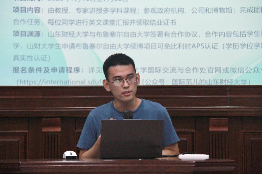 贾治霖同学则现身说法,以曾经留学过的城市布鲁塞尔为例,讲述了布鲁塞尔独有的风土人情,分享了留学期间生活学习的趣事,介绍了丰富多彩的欧洲文化,他分别从项目概述、访学课程、访学游览等方面分享了自己的留学经验,激起同学们强烈的好奇心和求知欲。具体介绍了布鲁塞尔自由大学的学制,师资力量;在课程学习方面,向同学们主要讲述了关于中资企业在欧洲和比利时的发展的内容,同时还通过图片等方式为大家展示了比利时国庆庆典、布鲁塞尔的饮食、交通及城市建设等,让大家感受到比利时的风土人情,壮观恢弘的建筑以及悠久的历史文明。还向同学们分享了护照、签证等海外留学注意事项,同时也勉励学弟学妹们为学习成长前路打好基础,做好准备。