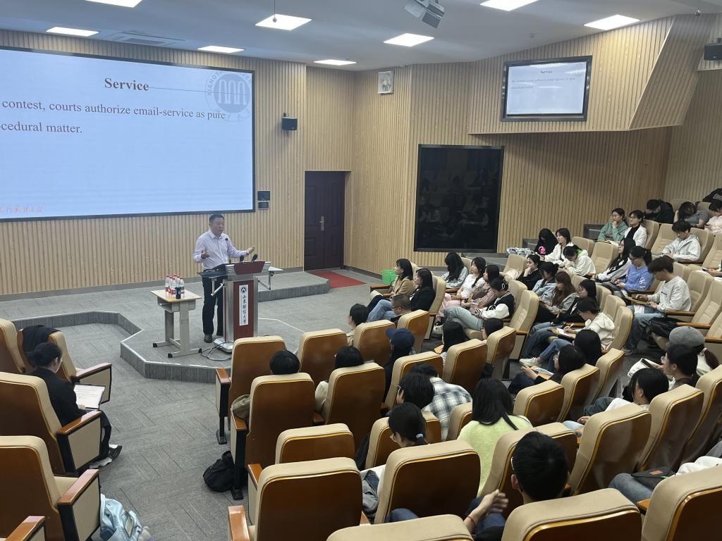 在讲座期间,覃斌武教授以幽默风趣的讲话风格和生动形象的类比举例,向在座师生剖析了中、美两国民事诉讼程序法的不同,以近年来美国法院对于我国跨境电商行使域外管辖权的案例为主旨,以其自身经办的案件为切入口,分析了此类案件数量激增的原因、讲解了法律争议焦点、提出了破解方案。覃斌武勉励在座同学,要常怀爱国之心,将法律人的职业追求同家国大义相结合,开阔眼界看世界。之后,覃斌武还为在场的同学剖析了刚刚举办的第十二届国际刑事法院模拟法庭比赛赛题,并为捕鱼游戏