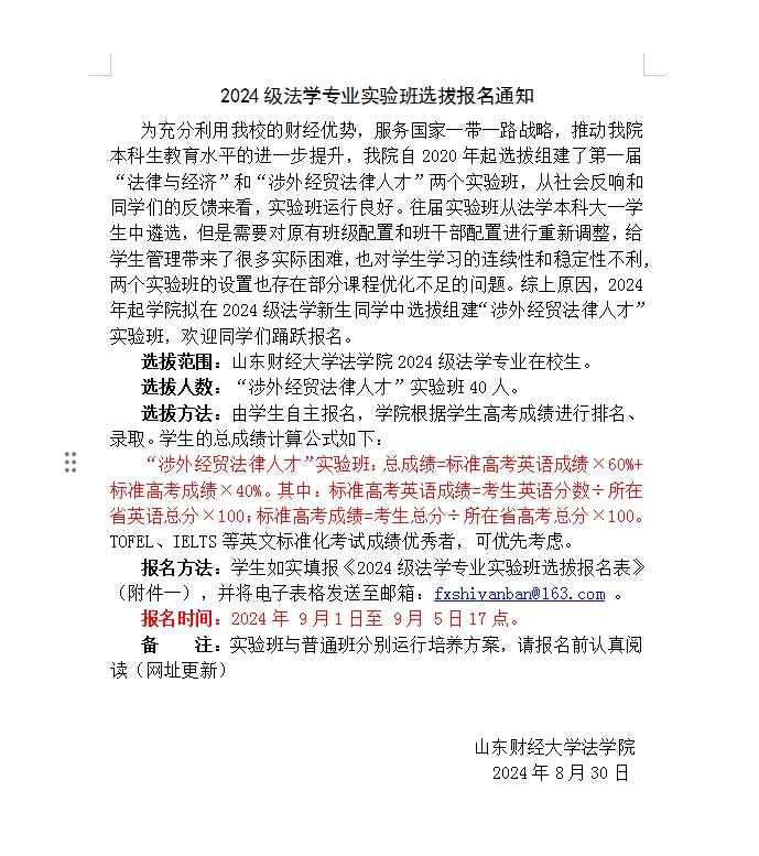 申请表下载: 2024级法学专业实验班选拔报名通知(发布).doc(申请表在最后一页)