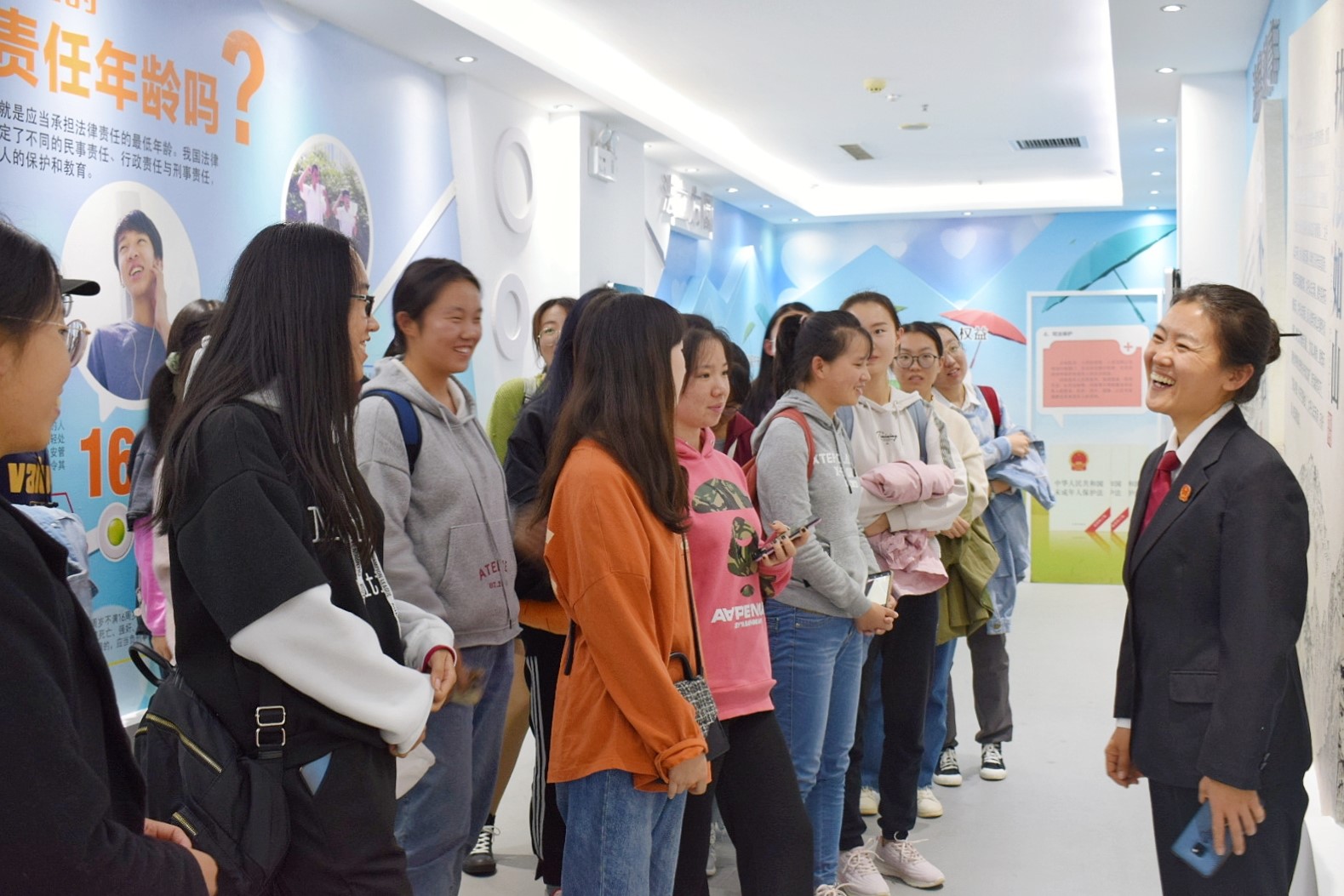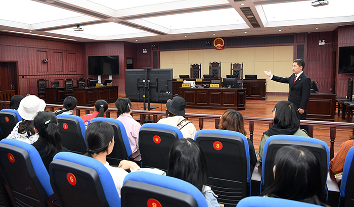 在省法院干警的引导下,同学们参观了司法广场、二十四小时法庭、法制宣传区、司法剧场、第二十二法庭、院史馆、青少年法治教育中心等场所,干警为同学们介绍了山东法院的发展历史和近年来取得的各项成绩,讲解了各部门的职能和作用,讲述了重大案件的审判流程,介绍了在审判工作的信息化、数字化建设方面的进展。