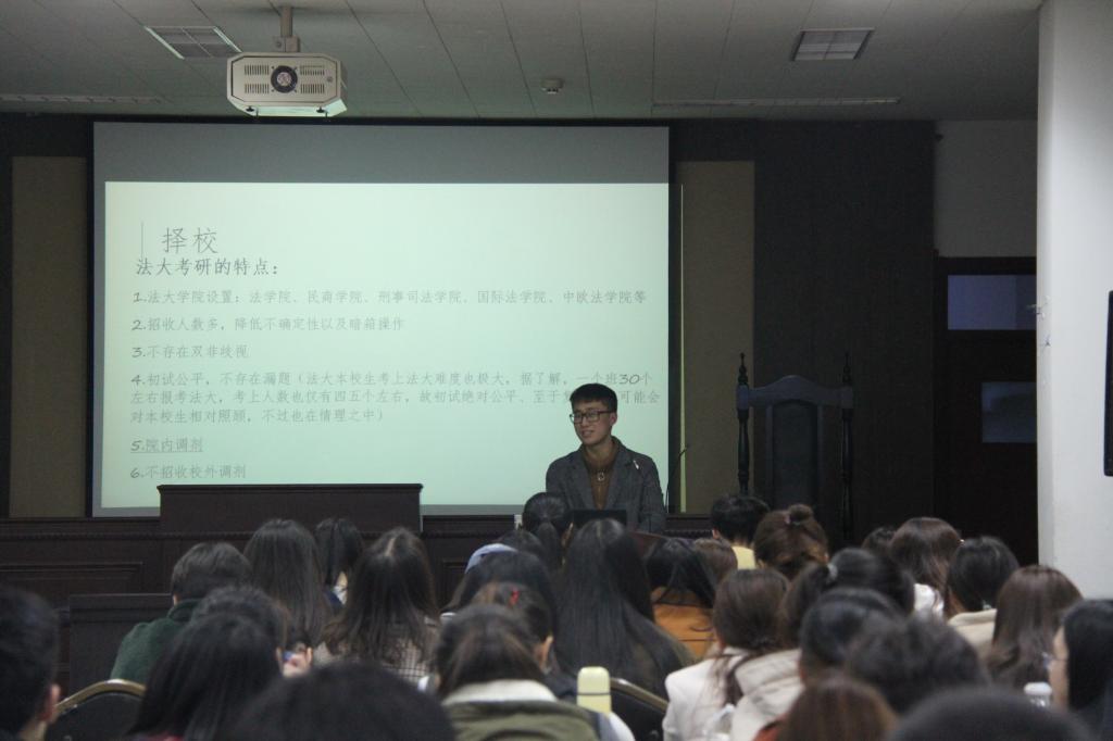 本次交流会邀请了成功考取中国政法大学的田野、黄家槺、李宗煊、卜泓予,对外经贸大学的陈金铭,厦门大学的黄明璇与东南大学的杨莉。七位学长学姐从院校和专业选择、备考方法与时间规划、自我能力认知与心态调整等方面,分析了研究生考试的不同形势,介绍了目标院校的招生情况,给出了专业课与公共课不同的复习方法,建议同学们既要夯实基础、有的放矢,也要劳逸结合、注重效率。提问环节中,同学们踊跃发言,向各位学长学姐提出自己的疑问,面对同学们的提问,学长学姐做出了详细的解析并提出了针对性建议。